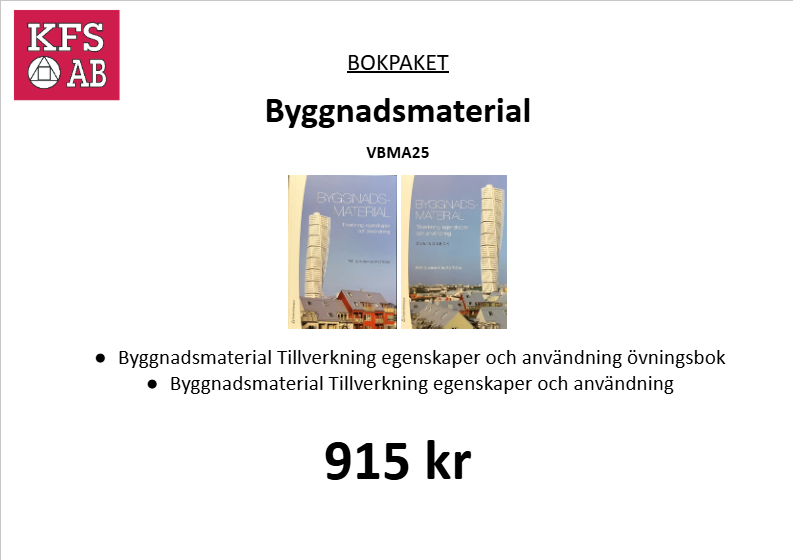 Kurslitteratur Bokpaket VBMA25/VBMA35 Byggnadsmaterial Lägg till en bevakning så meddelar vi dig så snart varan är i lager igen. Produkten är nu bevakad Vi meddelar dig så snart varan är i lager igen. E-postadress Lägg till bevakning Dina personuppgifter behandlas i enlighet med vår integritetspolicy. Bokpaket VBMA25/VBMA35 Byggnadsmaterial Bokpaket VBMA25/VBMA35 Böcker: Byggnadsmaterial - Uppbyggnad, tillverkning och egenskaper Byggnadsmaterial - Övningsbok