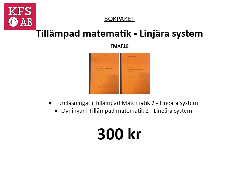 Kurslitteratur Bokpaket FMAF10 Tillämpad matematik Lägg till en bevakning så meddelar vi dig så snart varan är i lager igen. Produkten är nu bevakad Vi meddelar dig så snart varan är i lager igen. E-postadress Lägg till bevakning Dina personuppgifter behandlas i enlighet med vår integritetspolicy. Bokpaket FMAF10 Tillämpad matematik Bokpaket FMAF10 Böcker: Föreläsningar i Tillämpad matematik, Lineära system Övningar i Tillämpad matematik 2, Lineära system